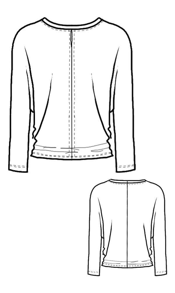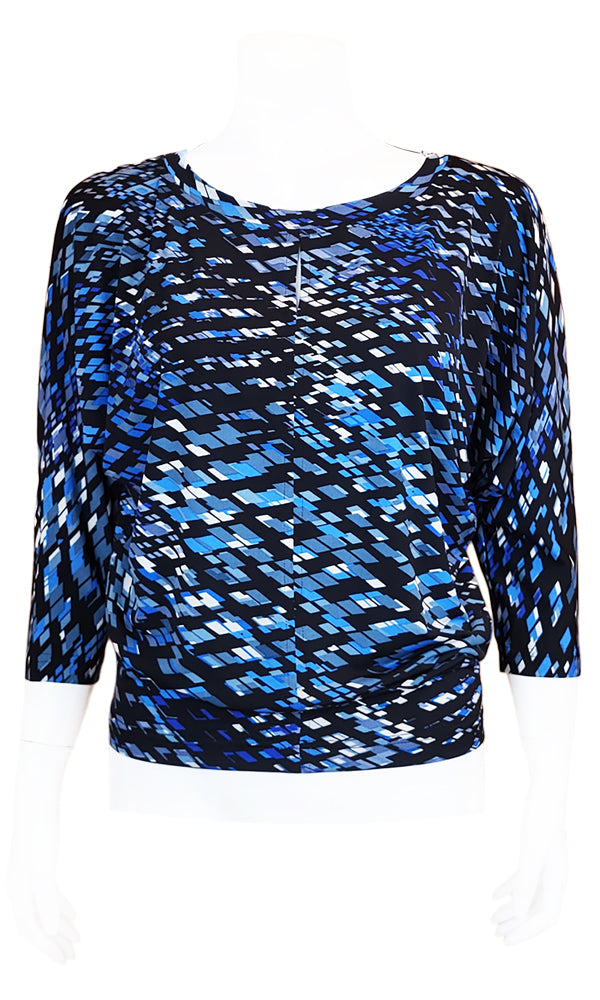 - Details: 3/4 length dolman sleeves / wide jewel neckline / stretchy, fitted hip with generously draped waist and bust