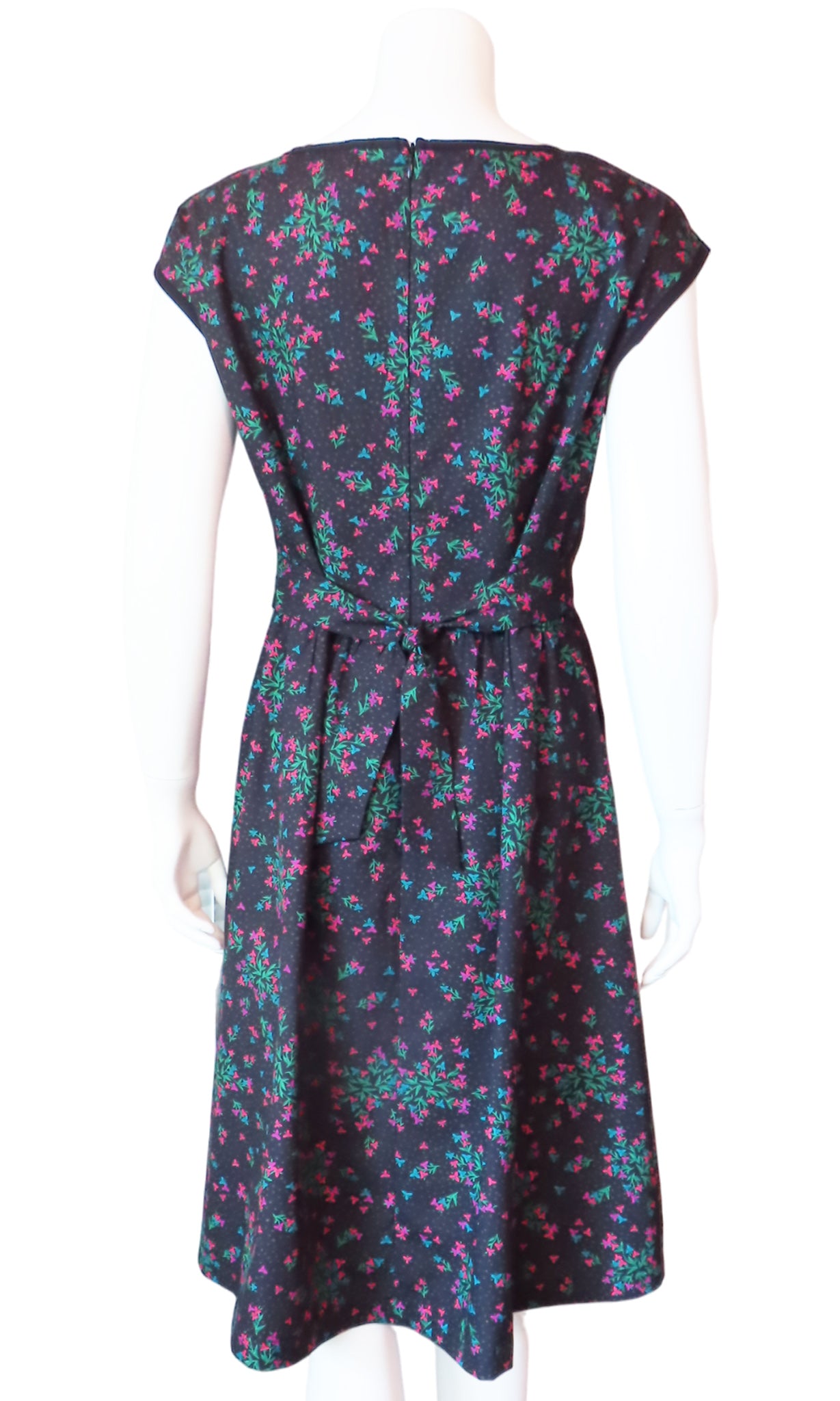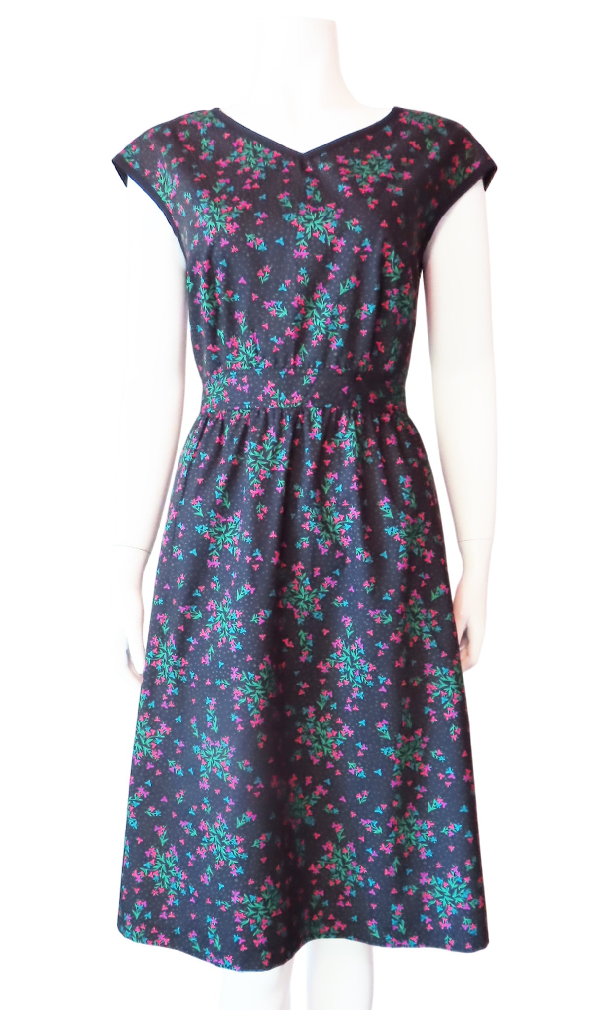 - Details: wide v-neck / darted bodice / cap sleeves / hip pockets / waistband with back ties / gathered waistline / back zipper