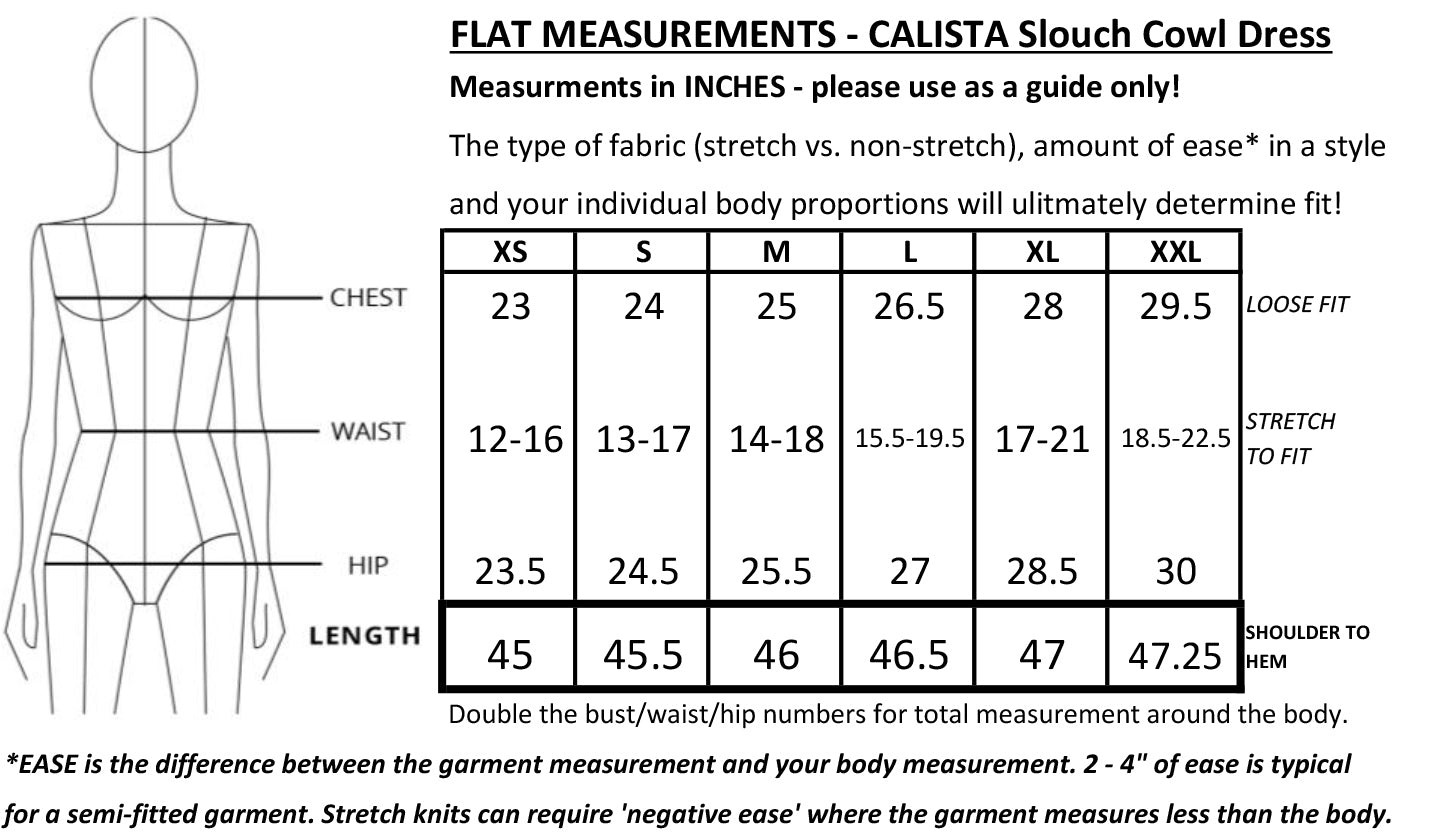 - Fit Tips: CALISTA is made with a full-stretch jersey and her bodice is relaxed and oversized. Best to go with your waist or hip measurement (whichever is larger) for best fit.