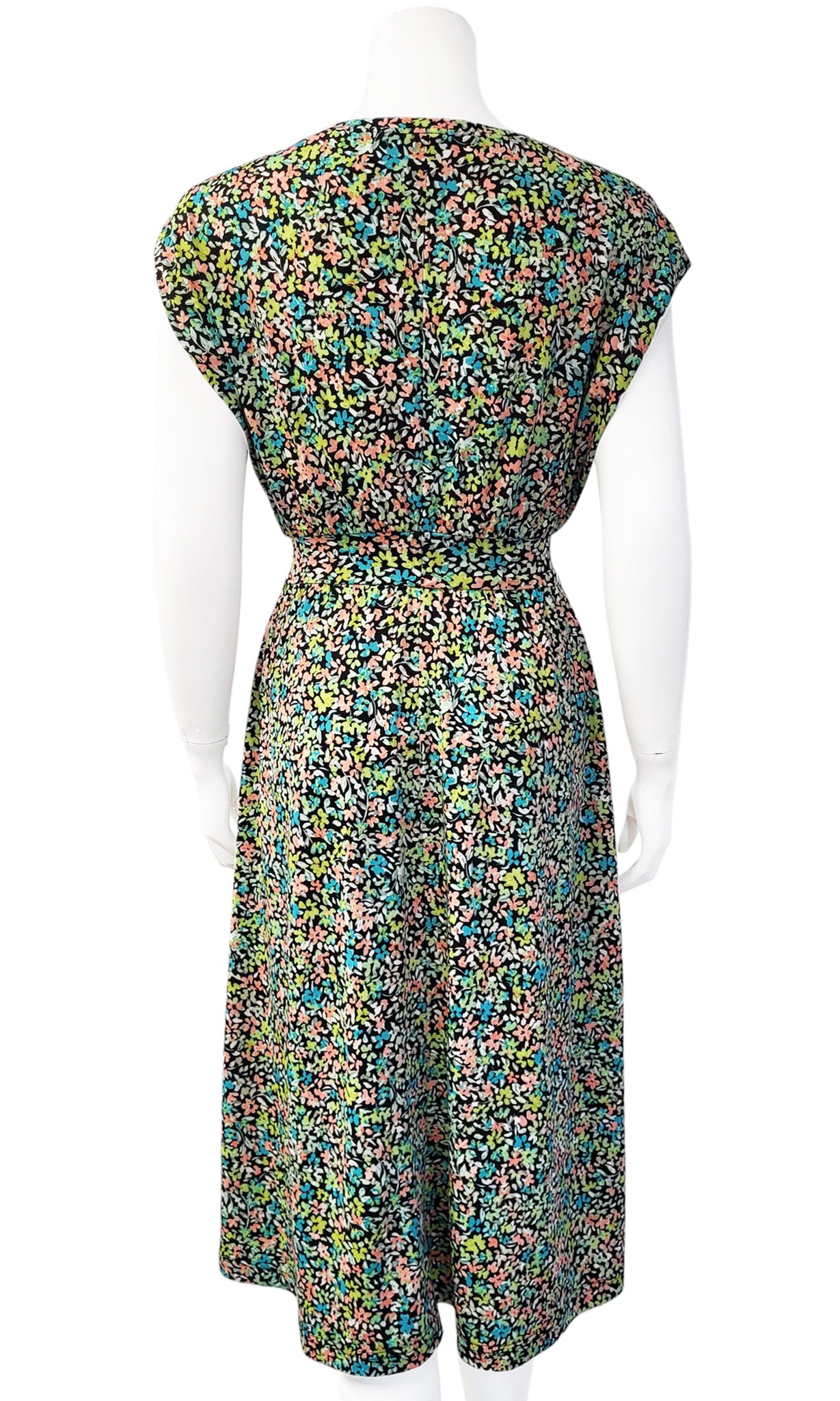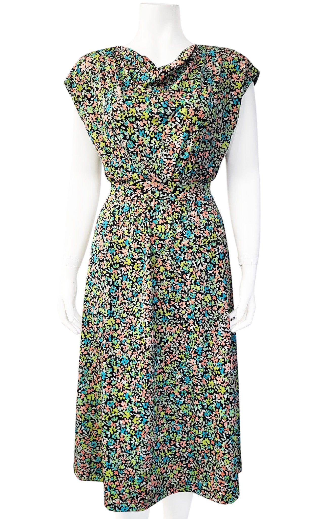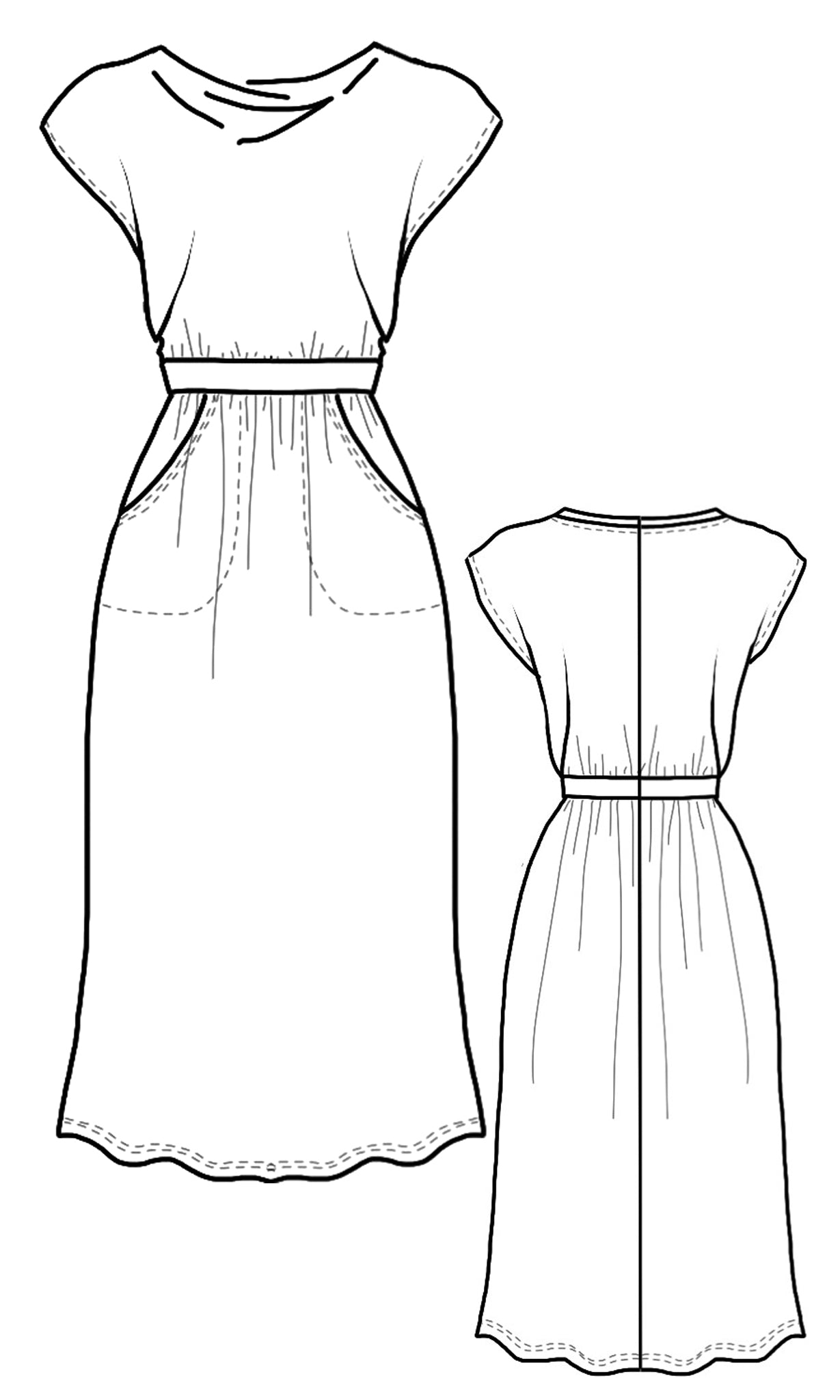 - Details: Moderate cowl neckline, blousy through bust, A-line skirt, stretch waist, hip pockets. Skirt falls below knee.