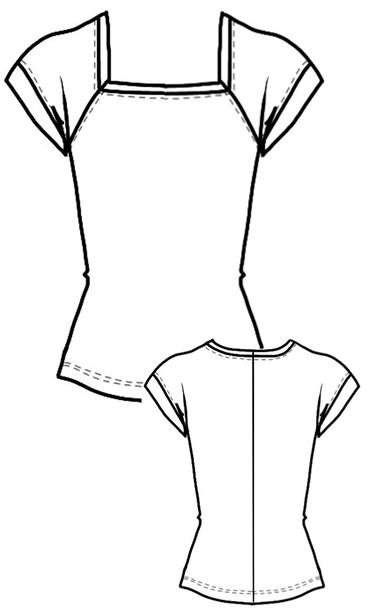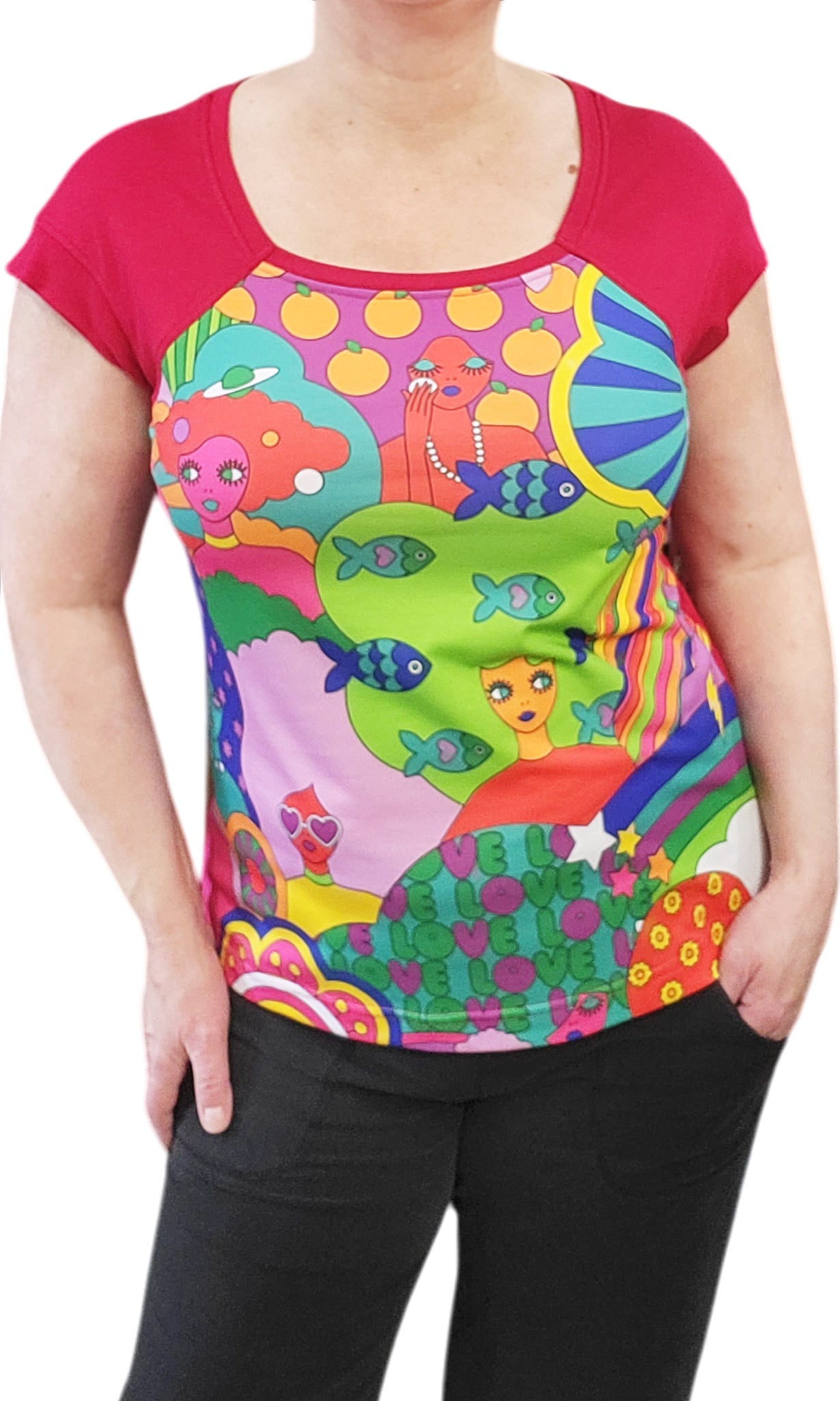 - Details: Front graphic panel, square neck, raglan yoke with extended cap sleeves.