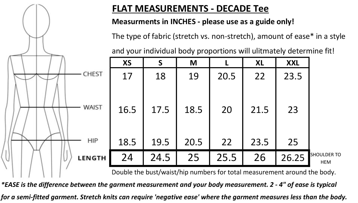 - Fit Tips: DECADE is stretchy and generously cut through the belly to flow away from your body. Use your bust measurement to determine best fit.