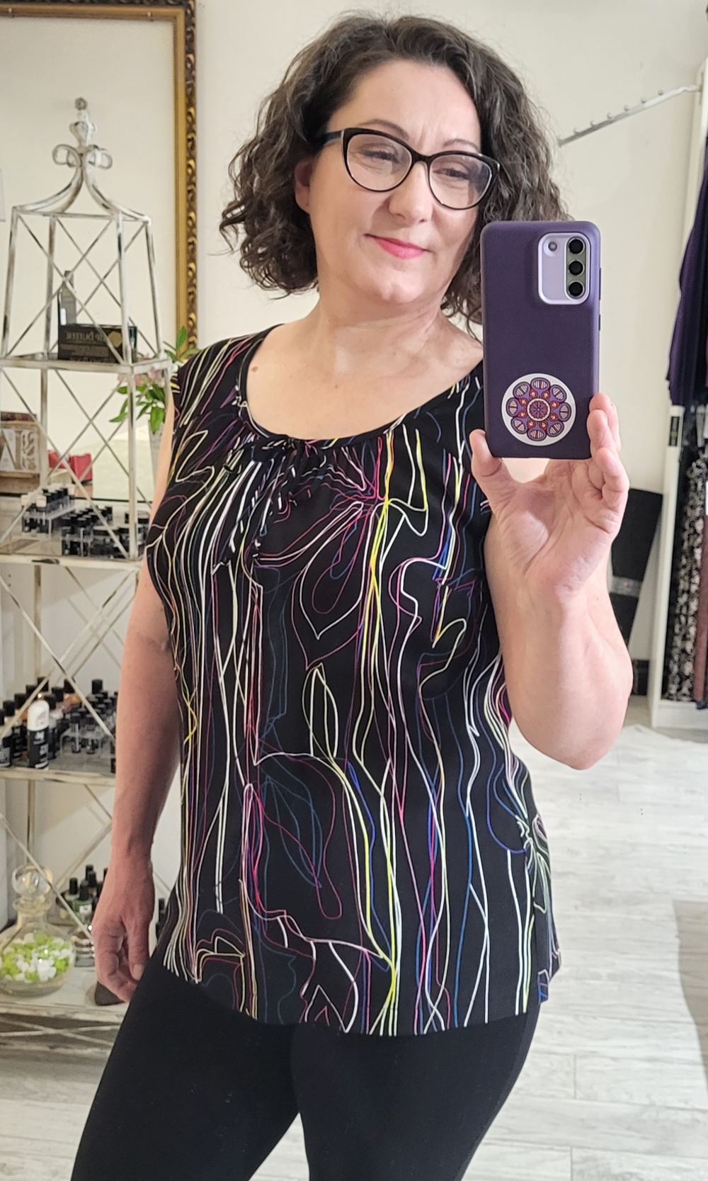 Flirty and floaty, Della ticks all the boxes when reaching for a simple but stylish top to pair with just about anything. Neckline gathers provide a whisper of shaping and a slit at centre front allows you to wear the sweet separate string tie...or not.