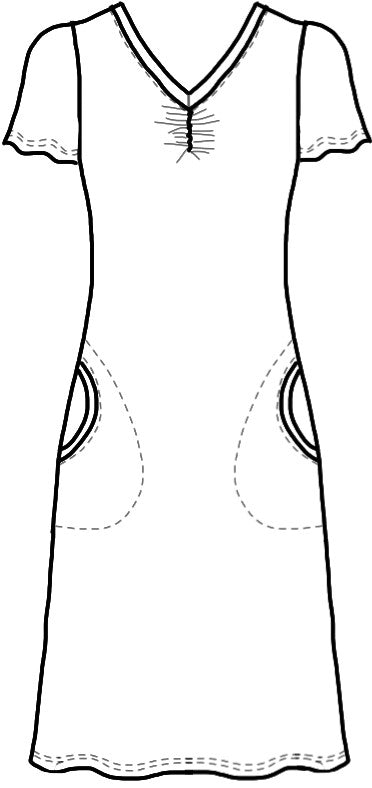 - Details: A-line short sleeves / Back bustle waist shaping / Hip pockets!