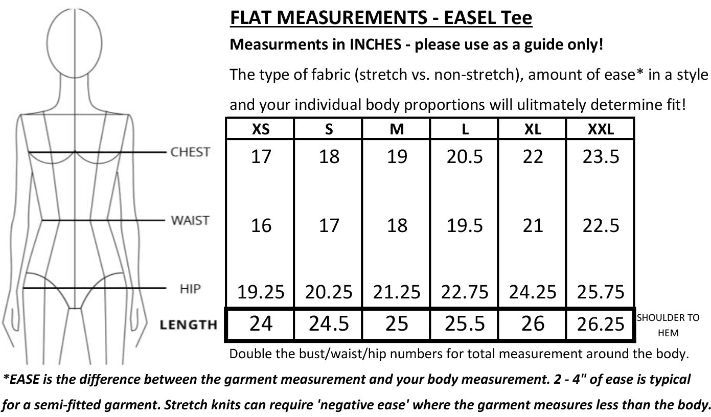- Fit Tips: EASEL is stretchy and generously cut through the belly to flow away from your body. Use your bust measurement to determine best fit.