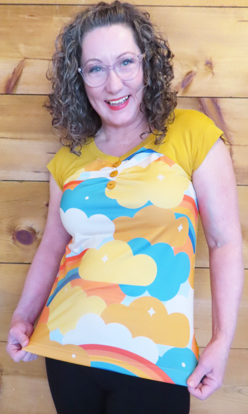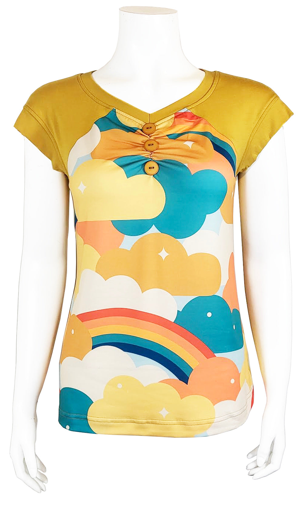 You'll be the masterpiece in one of our popular novelty tees freshened up for Spring '24! EASEL pairs a gorgeous art print front panel framed in a coordinating colour of buttery soft bamboo jersey. Her high V-neck finished with our signature triple-button bust gather detail and fitted cap sleeves make her a standout statement top that works effortlessly with your fave denim. Priceless!