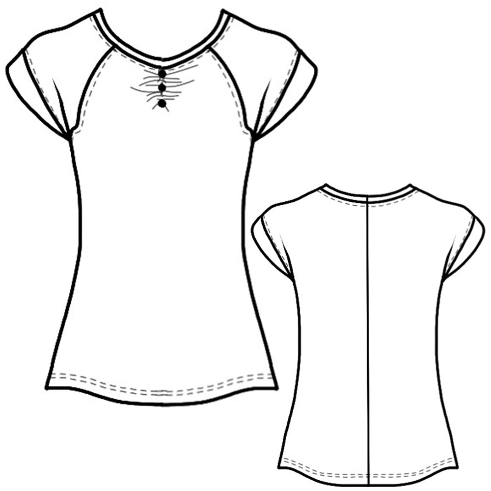 - Details: High V-nk with centre-front gathers and button detail / raglan yoked extended cap sleeve