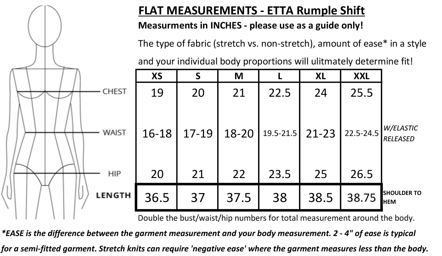 - Fit Tips: ETTA has a boxy, relaxed fit with back elastic to provide a little waist shaping. Use bust or hip measurement (whichever is larger) to determine best fit.