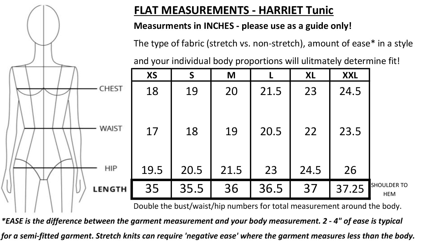 - Fit Tips: HARRIET has a bit more ease than usual allowing her to be worn over a base layer. Use your bust or hip measurement (whichever is larger) to determine fit.