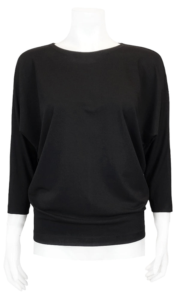 - Details: 3/4 length dolman sleeves / wide jewel neckline / stretchy, fitted hip with generously draped waist and bust
