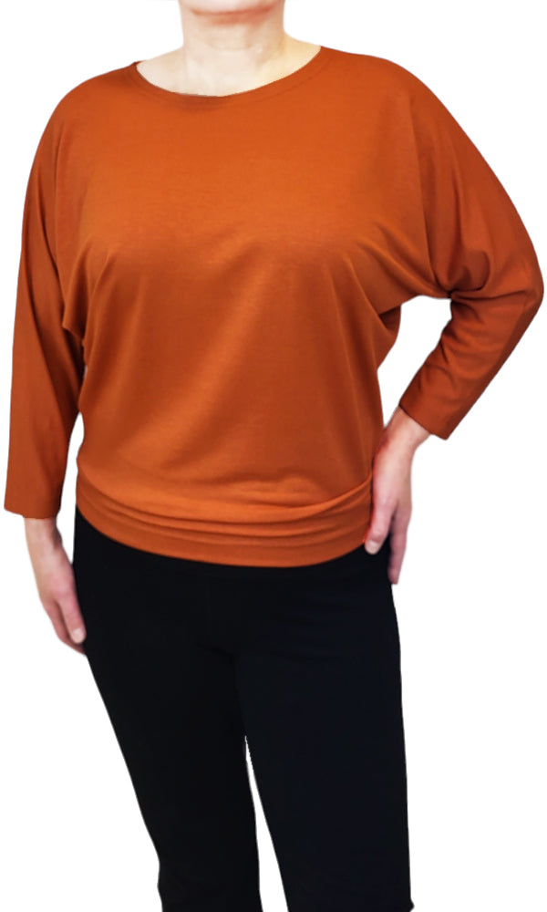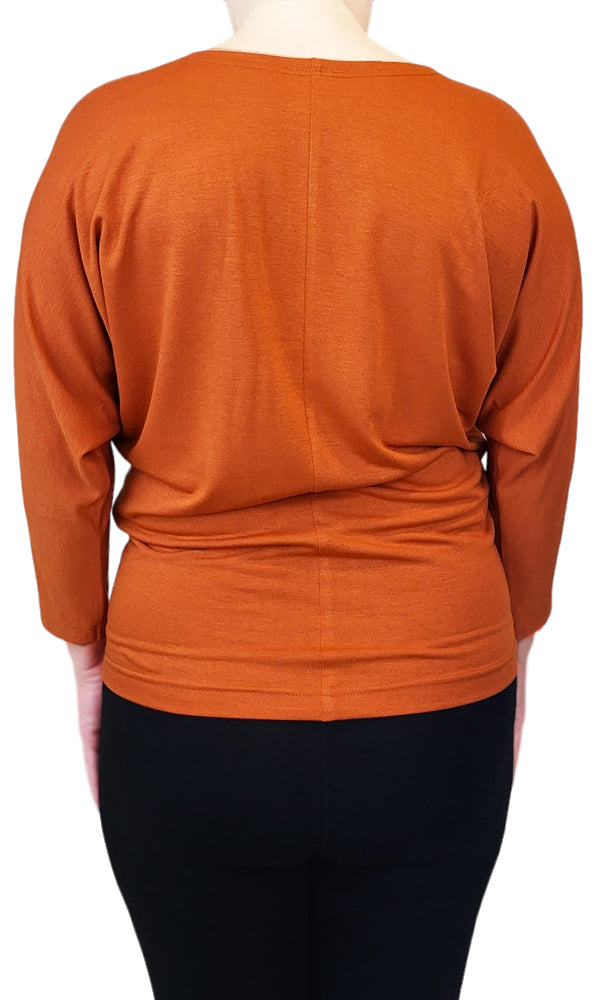 - Details: 3/4 length dolman sleeves / wide jewel neckline / stretchy, fitted hip with generously draped waist and bust