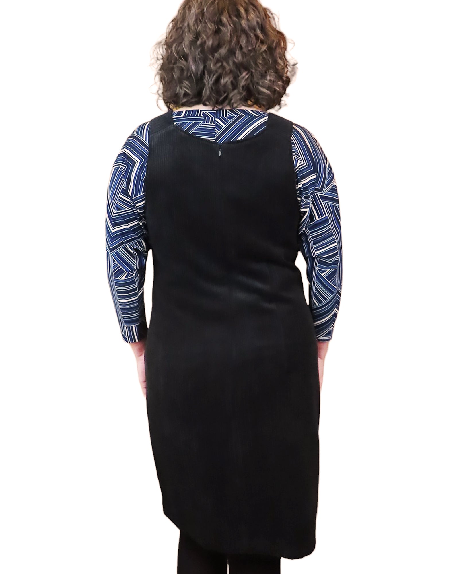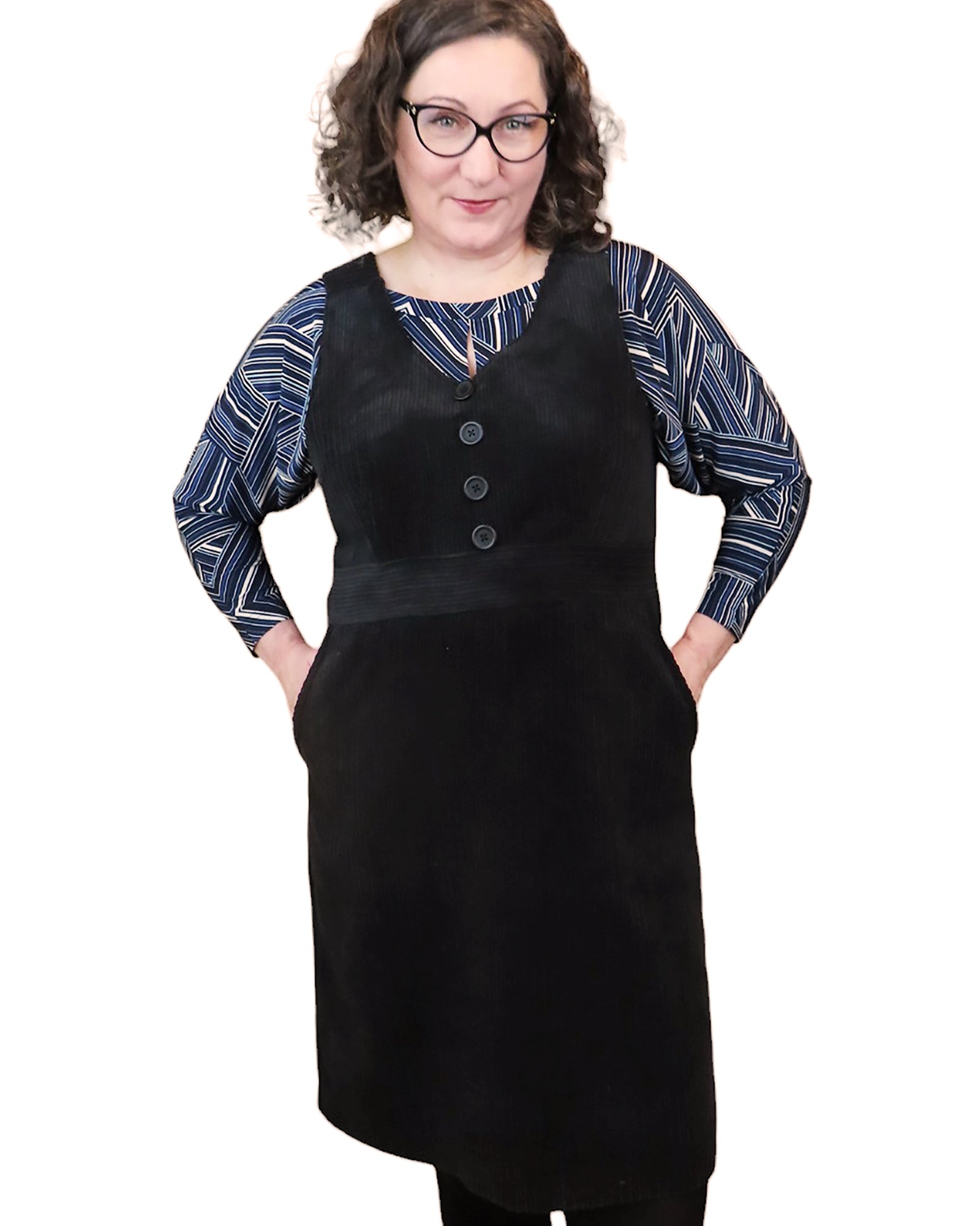 JONI is made with an irregular grooved corduroy and is cut a little oversized for pairing with a light sweater or fun long sleeve print. Her cute buttons and banded details make this crisp fall staple a must have!