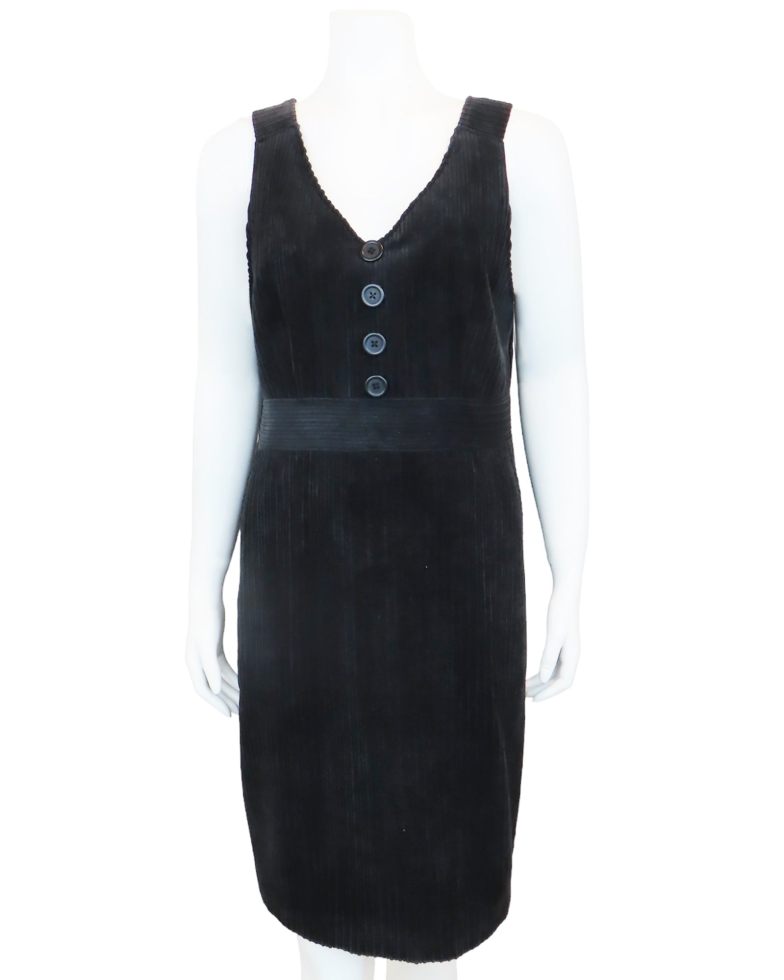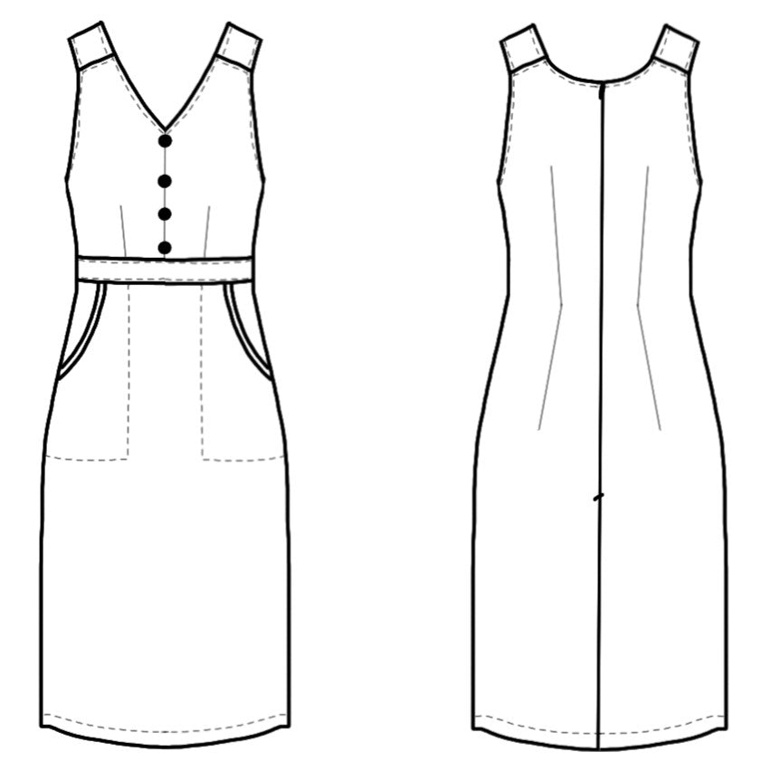 - Details: back zip closure / deep v-neck / low armhole / waistband and shoulder details / decorative front buttons / hip pockets