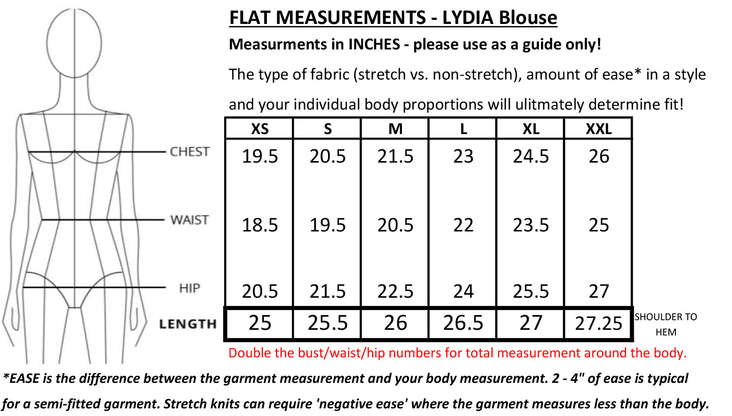 - Fit Tips: LYDIA is a flowy, subtly shaped, pull-on blouse with no stretch. Use bust measurement to determine fit.