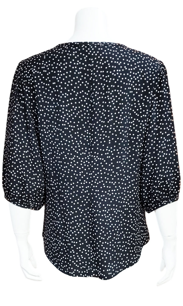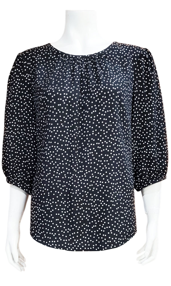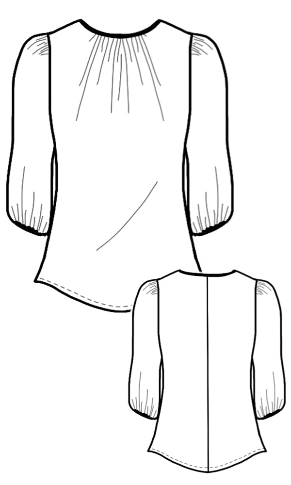 - Details: Jewel neckline with gathers / slightly puffed 3/4 sleeve / scooped hem (1" dip at centre-front).