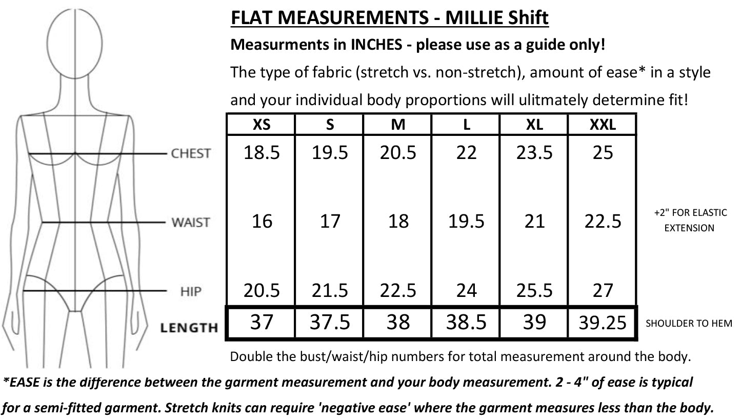 - Fit Tips: MILLIE is a semi-fitted, subtly shaped, pull-on shift with no stretch. Use largest body measurement to determine fit.